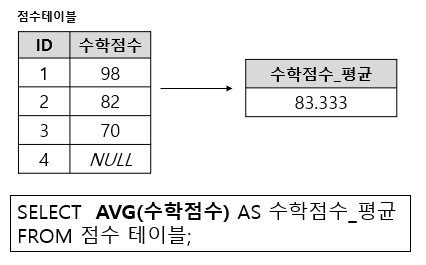 - 위의 예는 NULL값을 제외한 3개의 행에 대한 평균값을 계산한 것