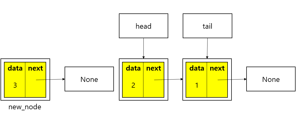 - 클래스의 instance 변수로 head와 tail이 있고 모두 None값으로 초기화