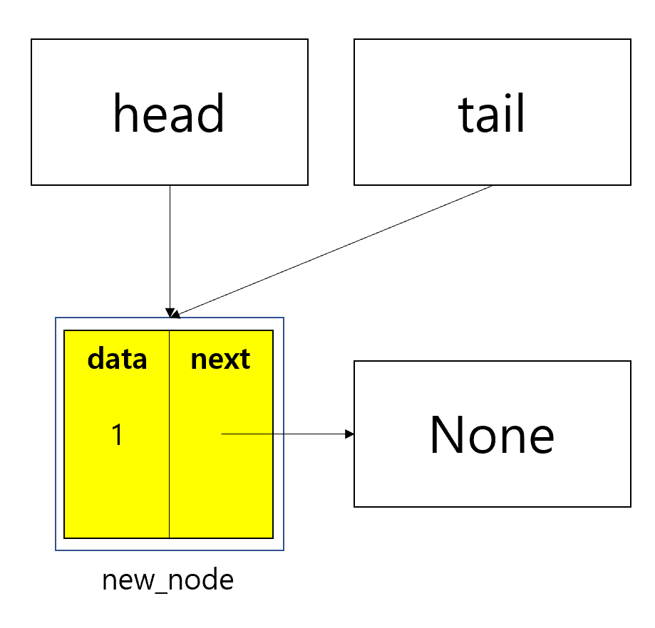 총 1개의 node만 있으므로 tail로 새로 추가된 node를 가리킴.