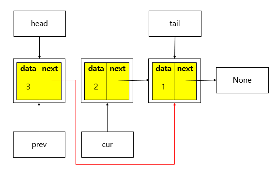 prev 변수를 도입하여 cur이 가리키는 노드를 참조하고, cur 변수는 현재 가리키는 노드의 next가 가리키는 노드 참조.