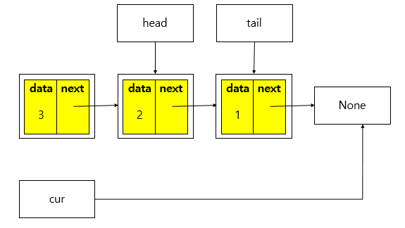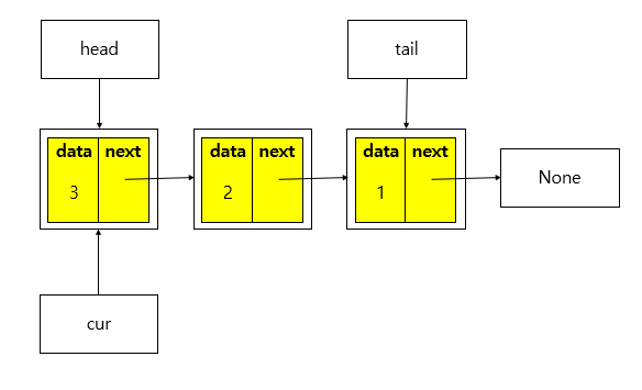 head는 현재 가리키는 노드의 next가 가리키는 노드를 참조해야 함. 그리고 cur에는 None 할당