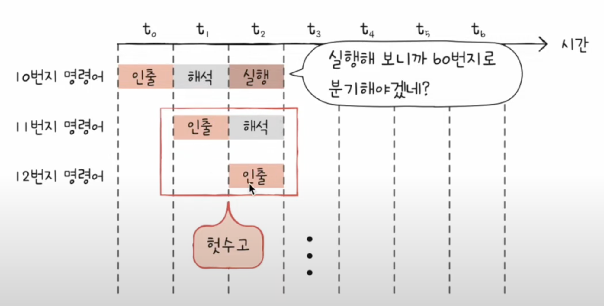 - 분기 등으로 인한 프로그램 카운터의 갑작스러운 변화가 생기면 명령어 파이프라인에 가지고 와서 처리 중(ex) 인출, 해석)이던 명령어들이 쓸모 없어짐