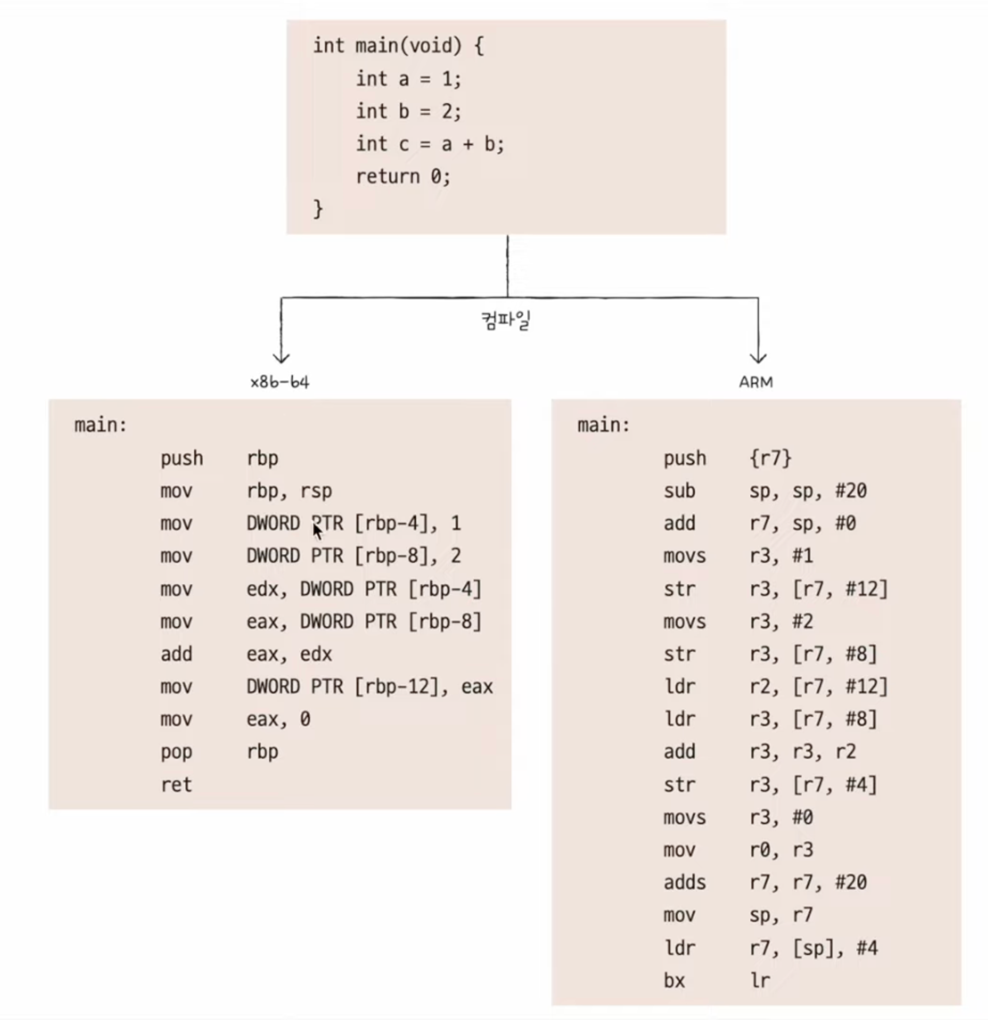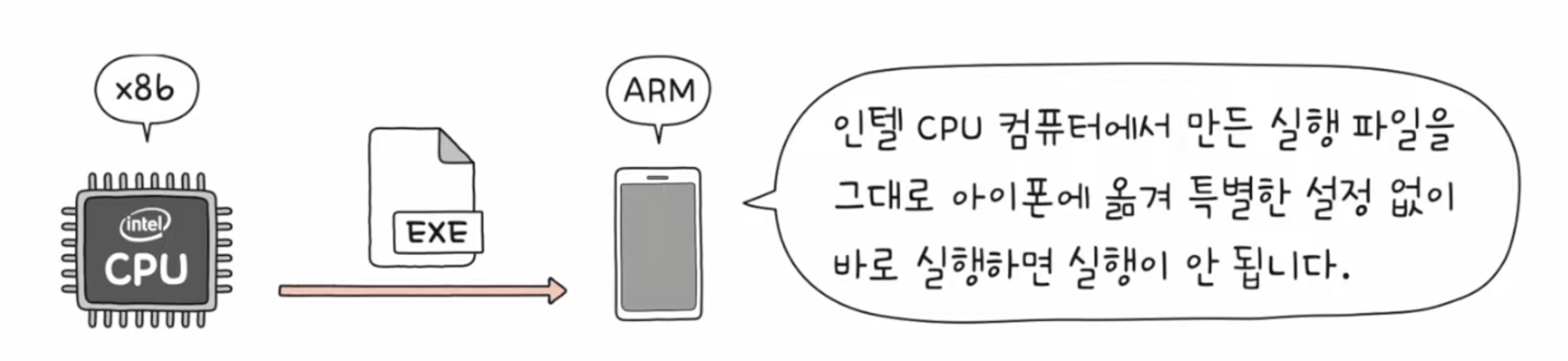 - 인텔의 CPU가 이해할 수 있는 명령어 집합과 아이폰의 CPU가 이해할 수 있는 명령어 집합은 다름