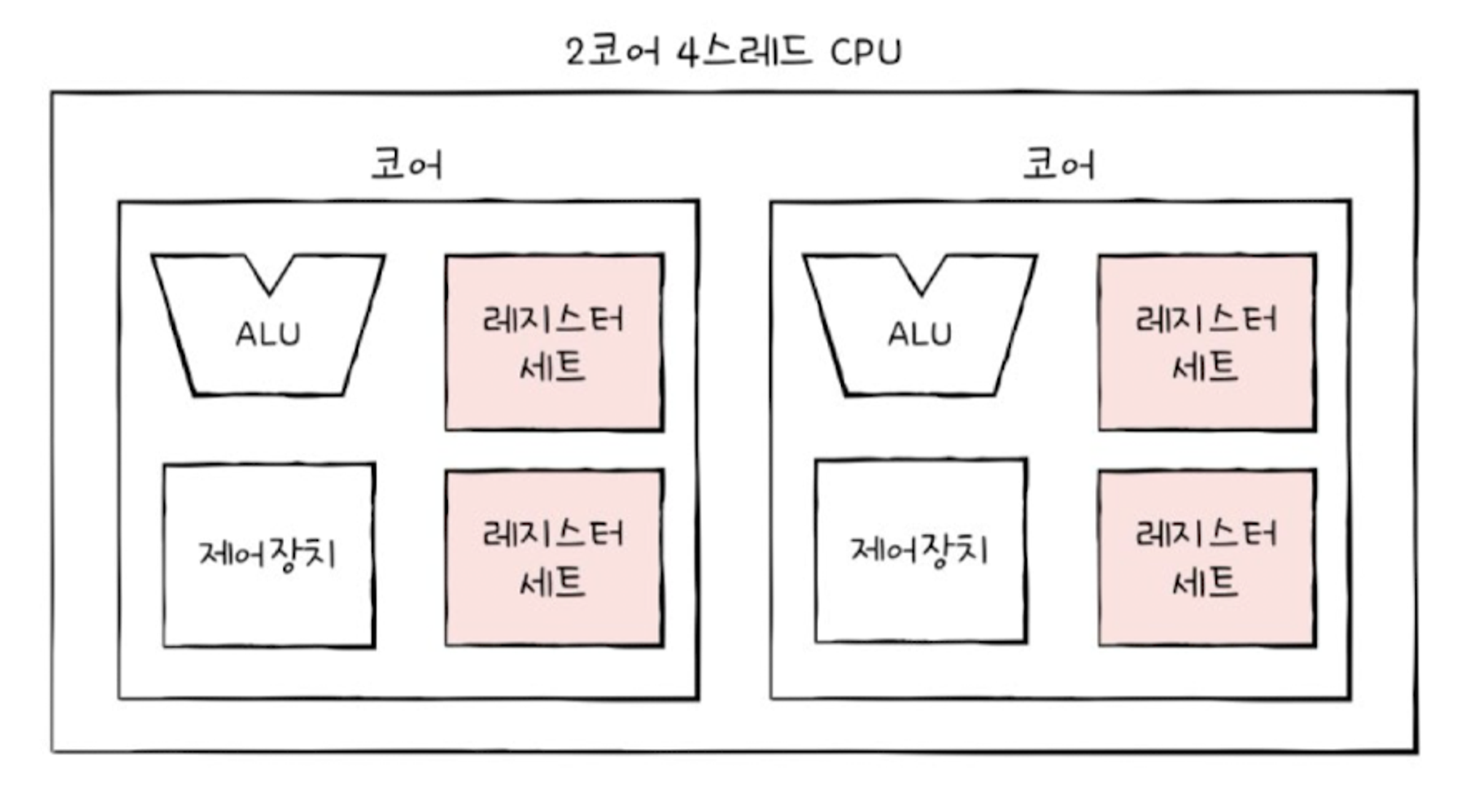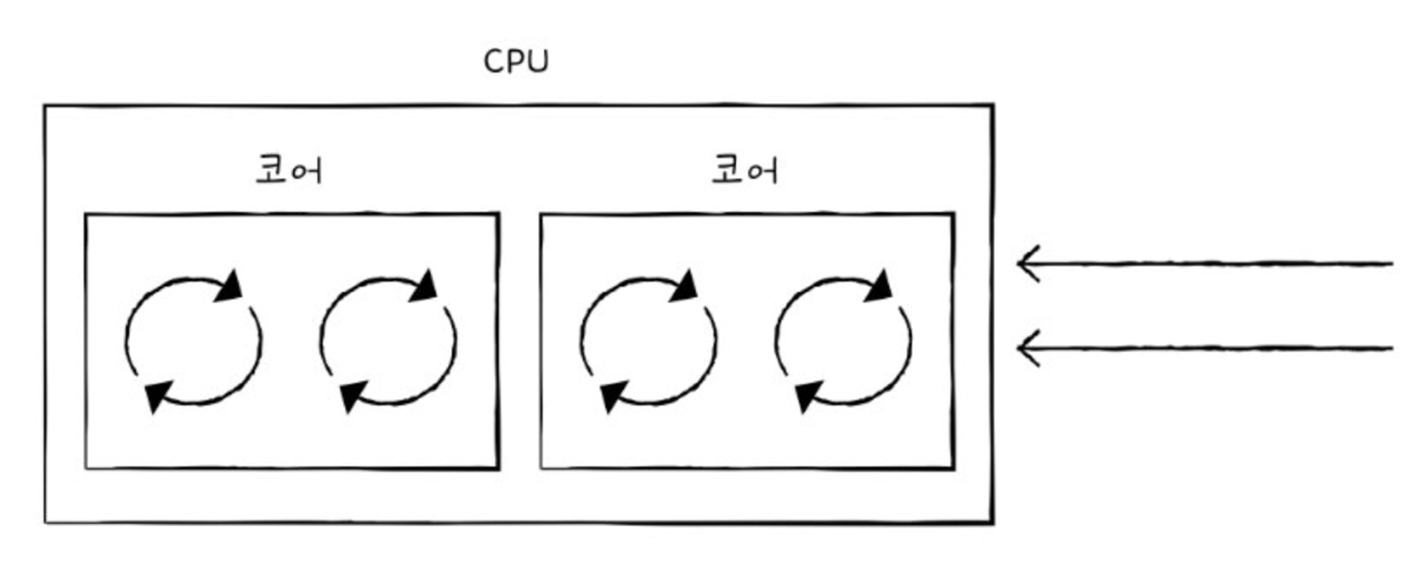- 2코어 4스레드 CPU: 아래 그림처럼 명령어를 실행하는 부품 2개, 한번에 4개의 명령어를 처리할 수 있는 CPU를 의미 (멀티스레드 프로세서, 멀티스레드 CPU)