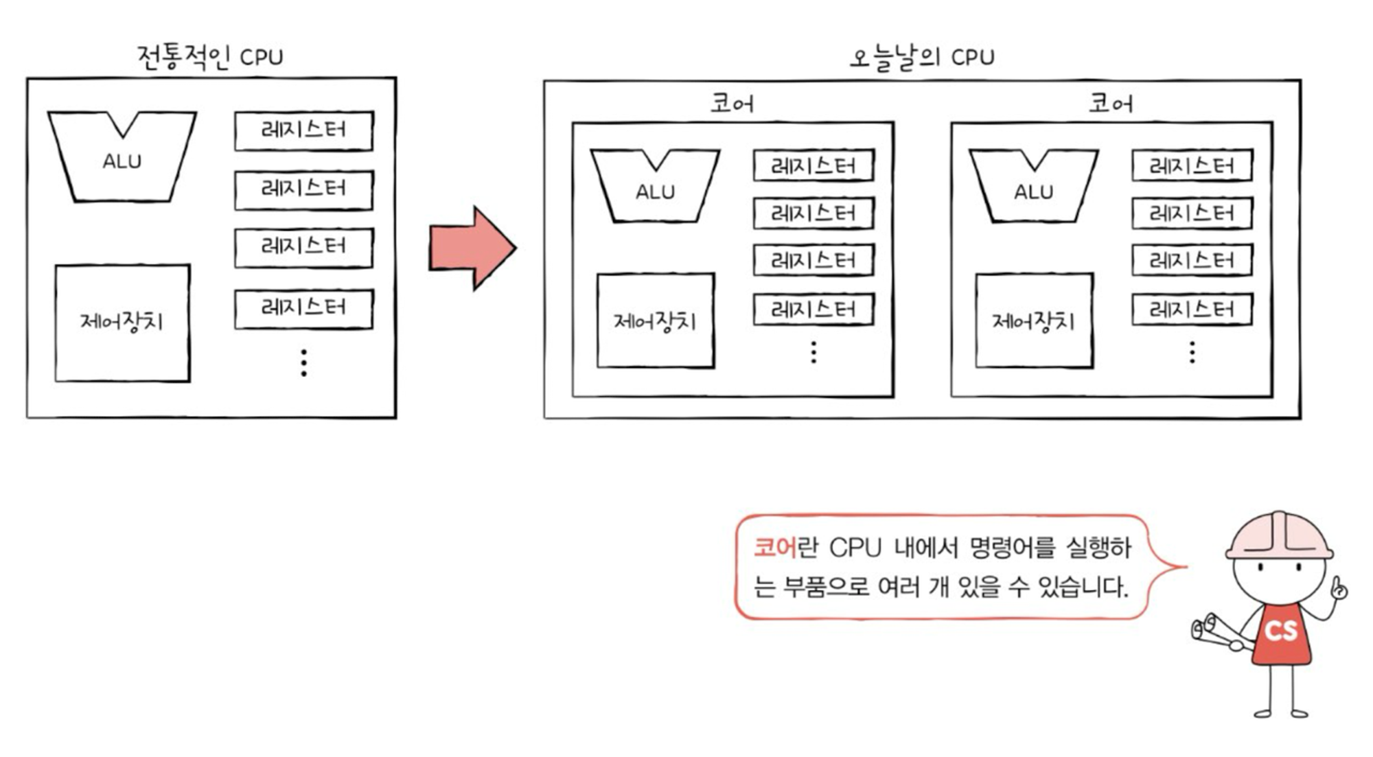- 명령어를 실행하는 부품으로, CPU가 기술적으로 많은 발전을 거듭하면서 단순히 “명령어를 실행하는 부품” → “명령어를 실행하는 부품을 여러 개 포함하는 부품”으로 확장됨