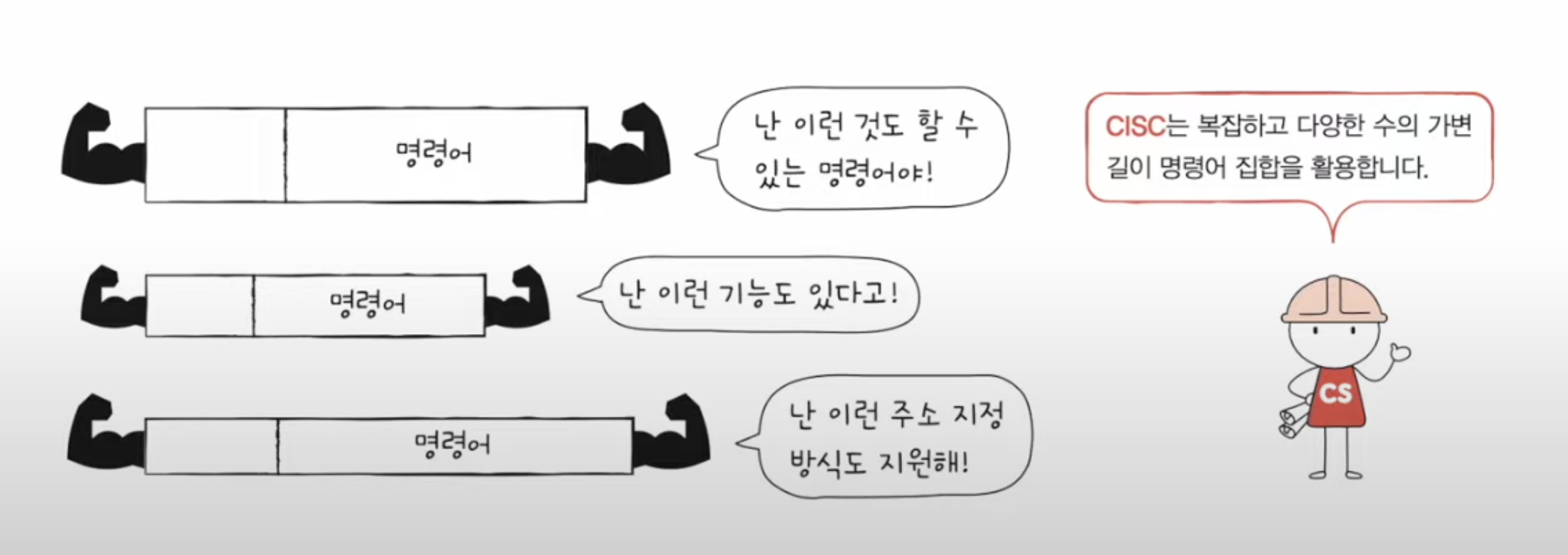 - 명령어가 워낙 복잡하고 다양한 기능을 제공해 명령어의 크기와 실행되기까지의 시간이 일정하지 않음