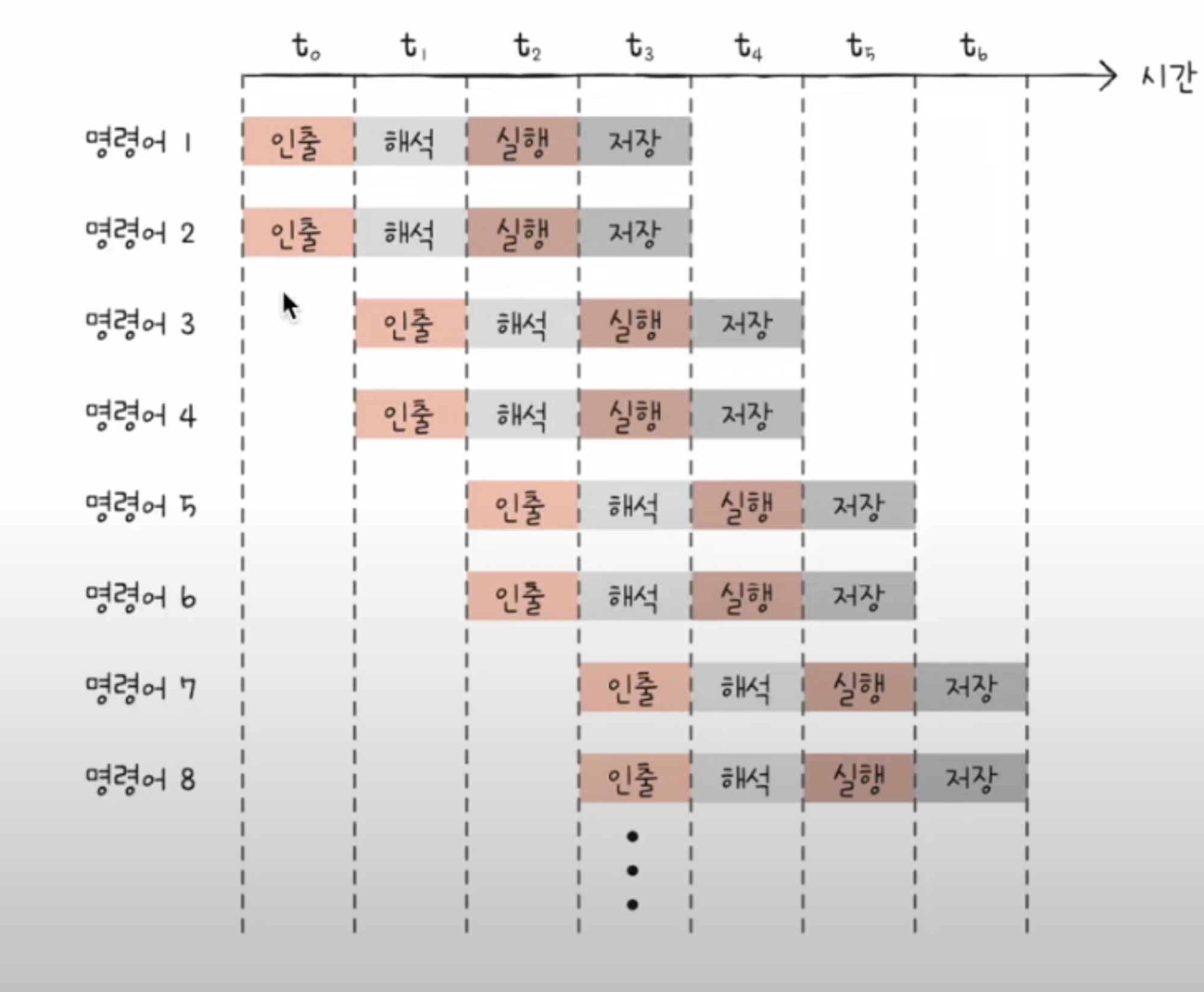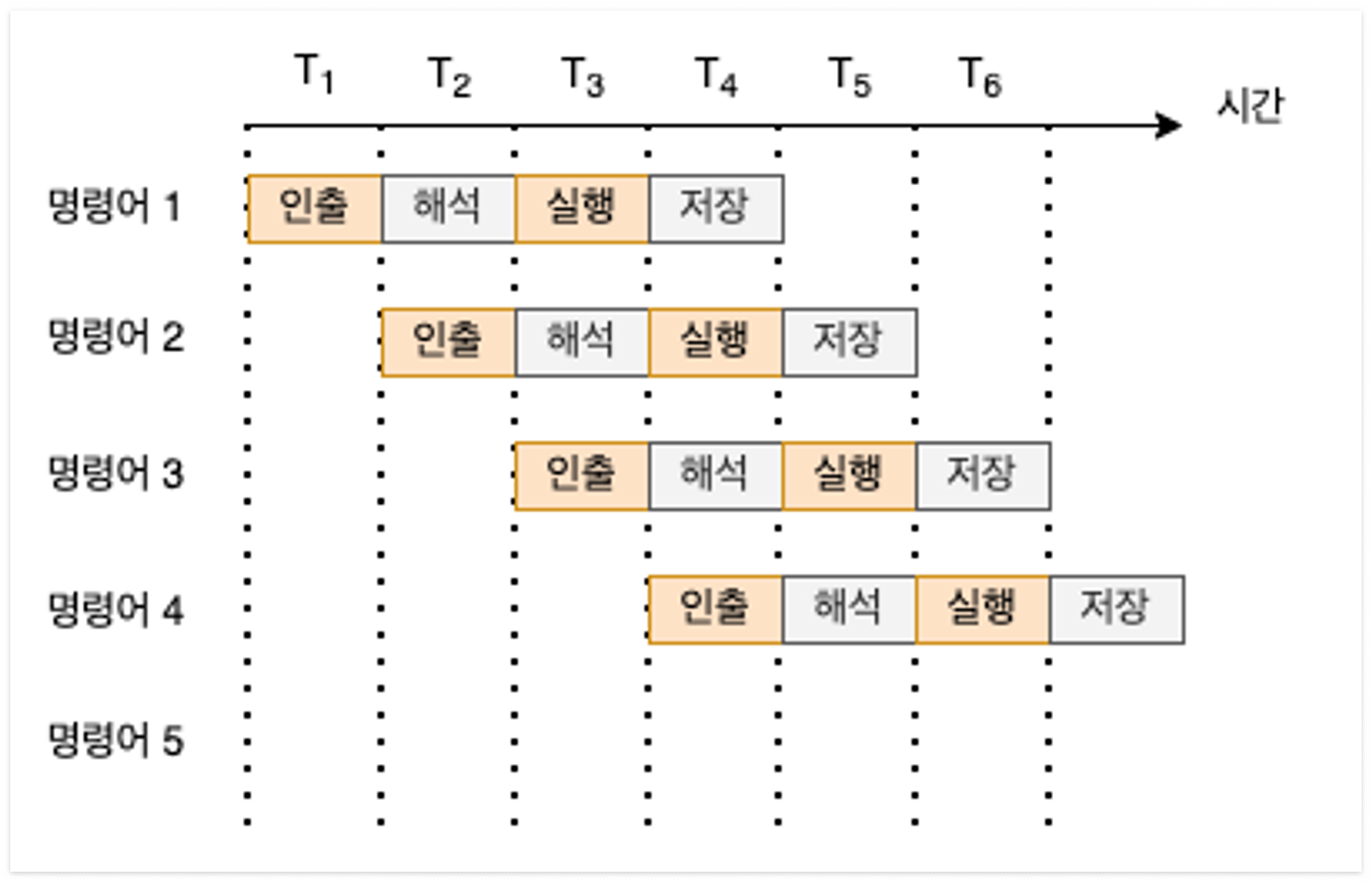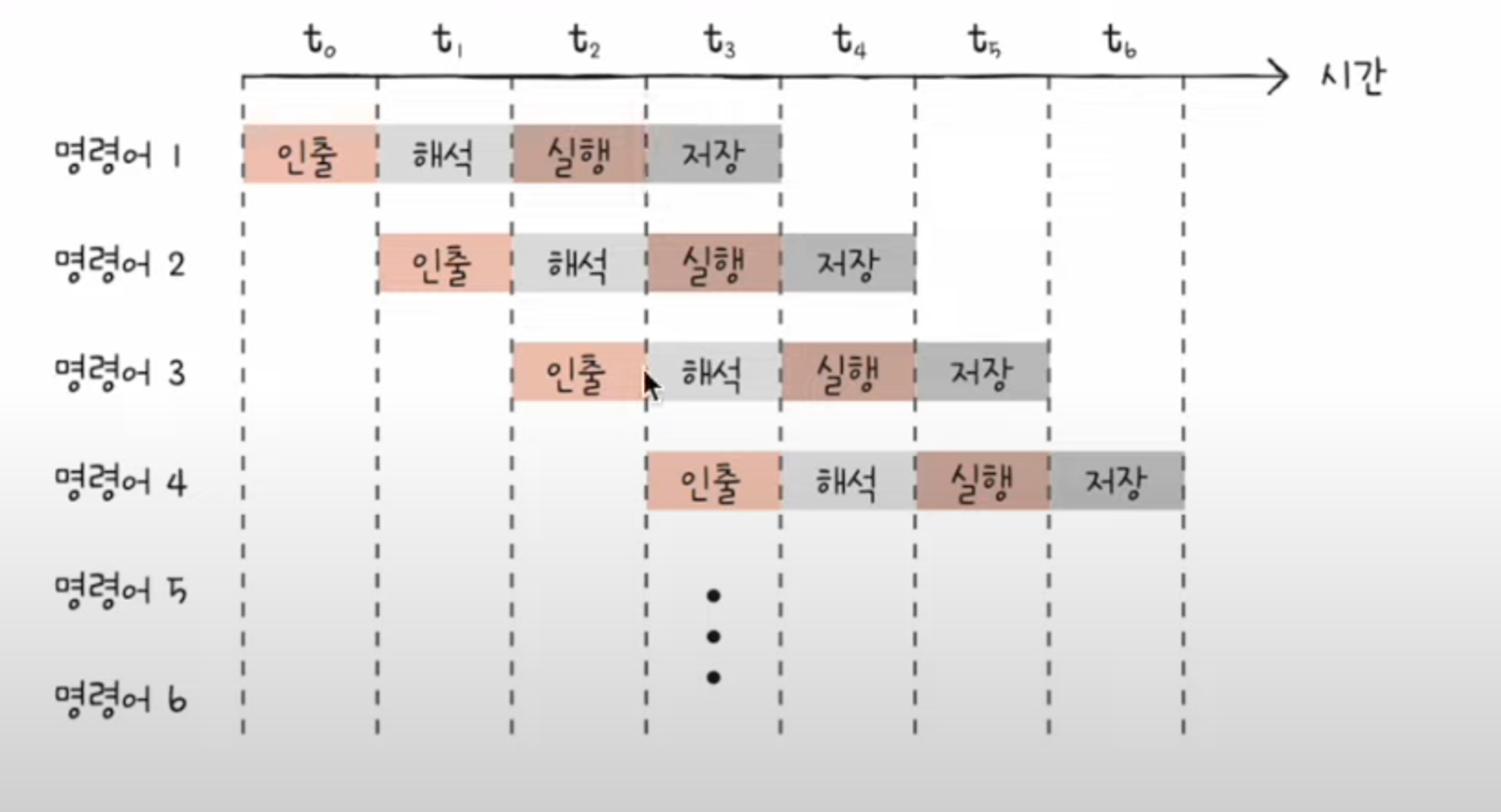 ⇒ 명령어 파이프라인에 넣고 동시에 처리하는 기법을 명령어 파이프라이닝이라고 함