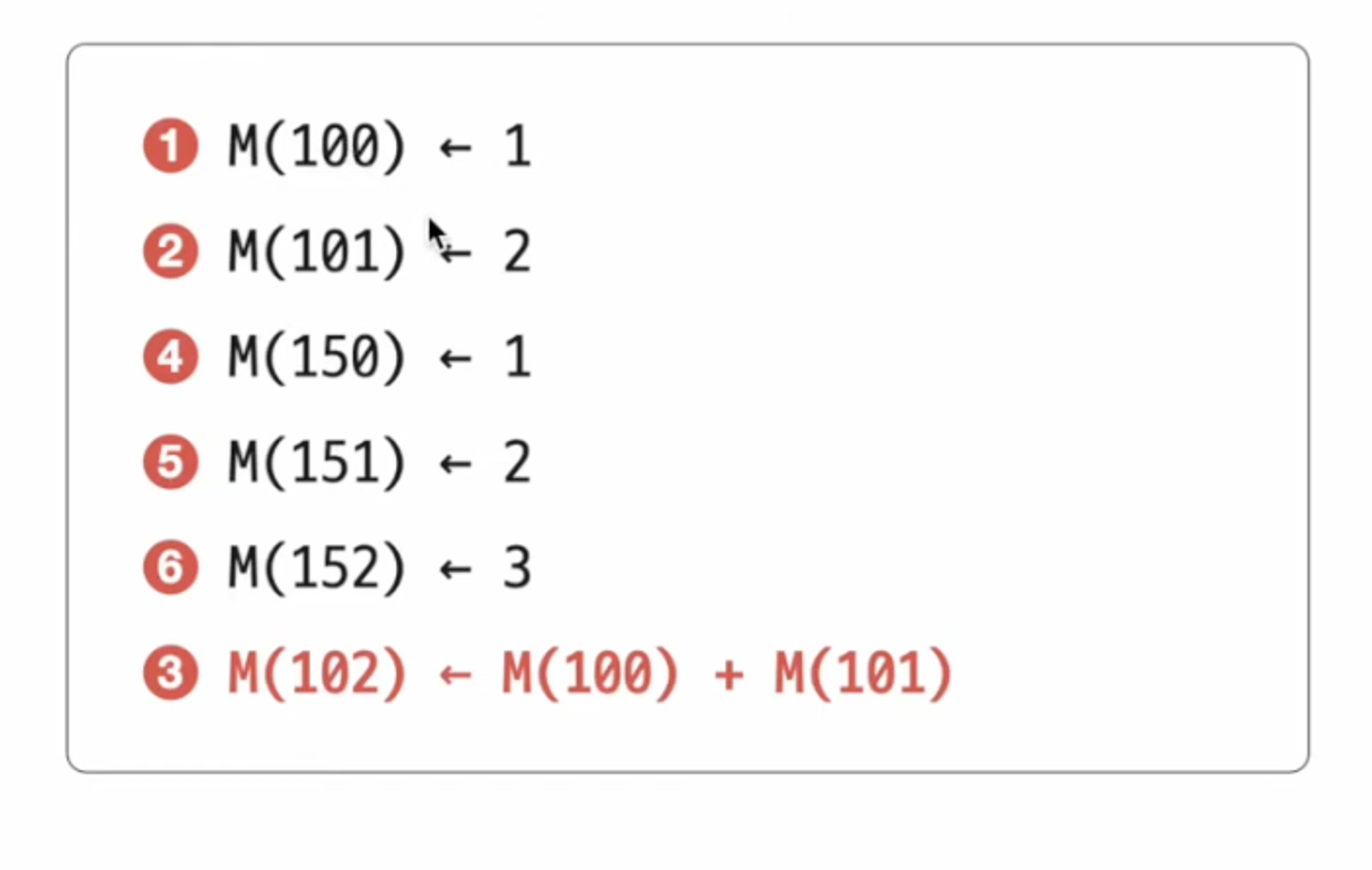 3번째 명령어 (M(102) <- M(100) + M(101)) 에서 1, 2번째 명령어의 결과가 필요하기 때문에 이상적인 성능 향상을 이끌 수 없음