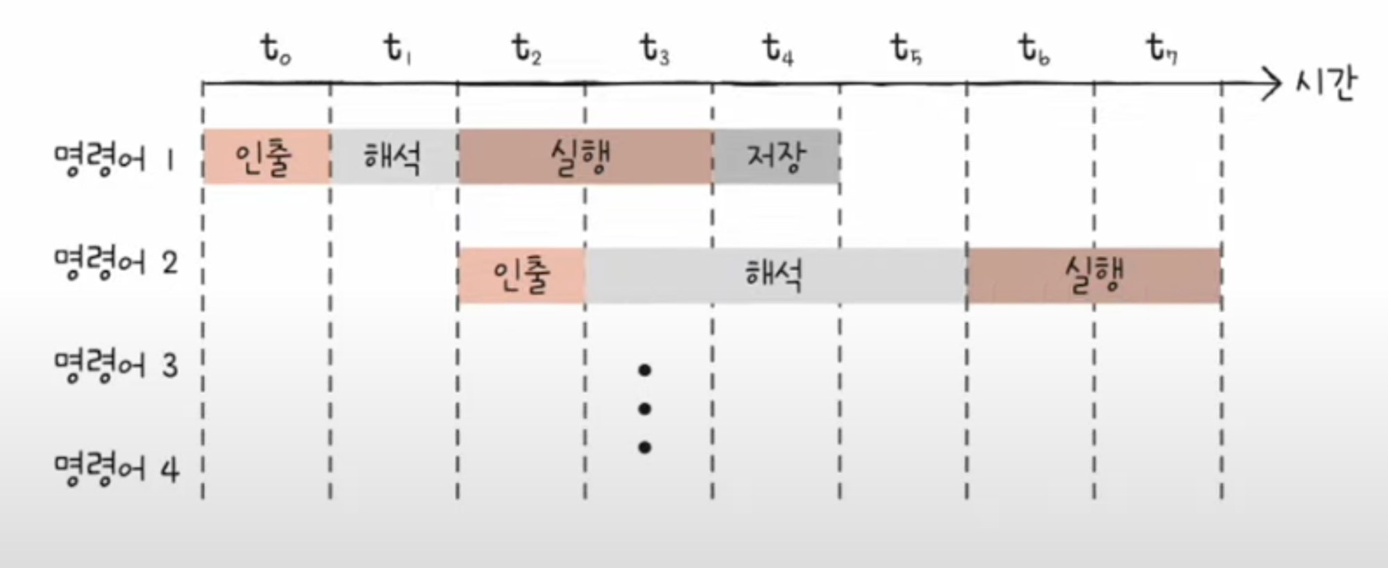 - 명령어를 동시에 처리하여 CPU를 한시도 쉬지 않고 작동시키는 기법