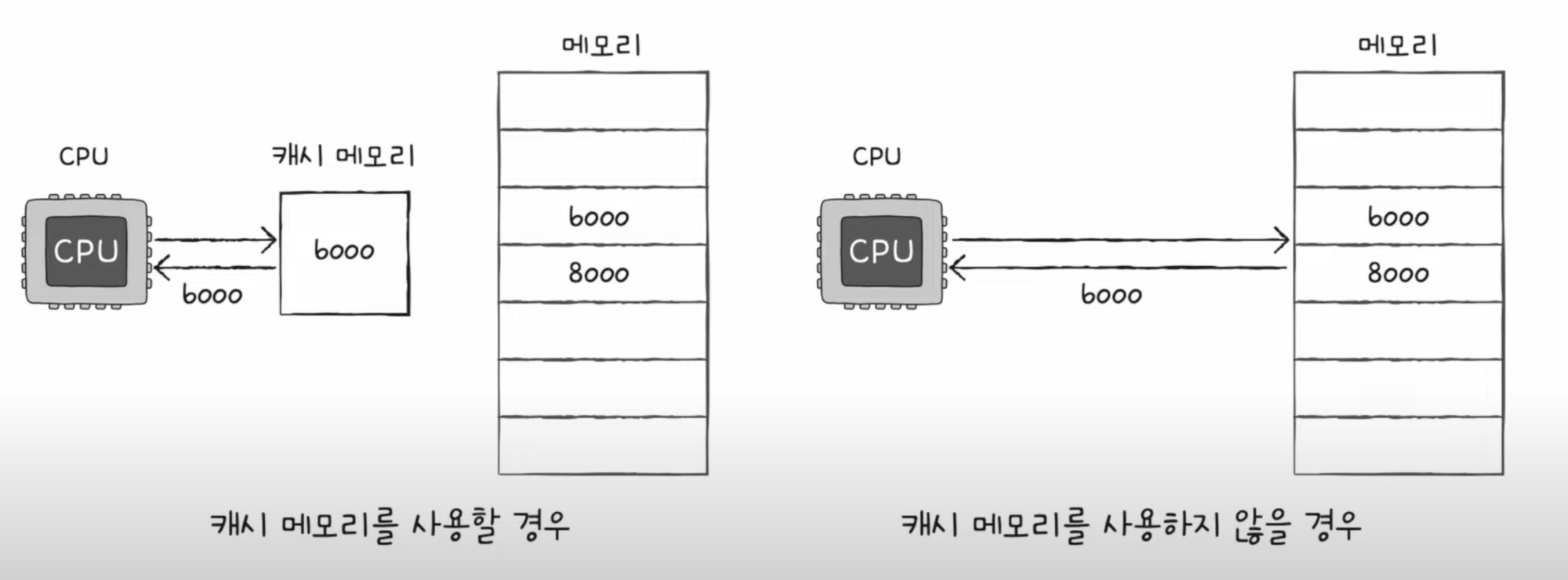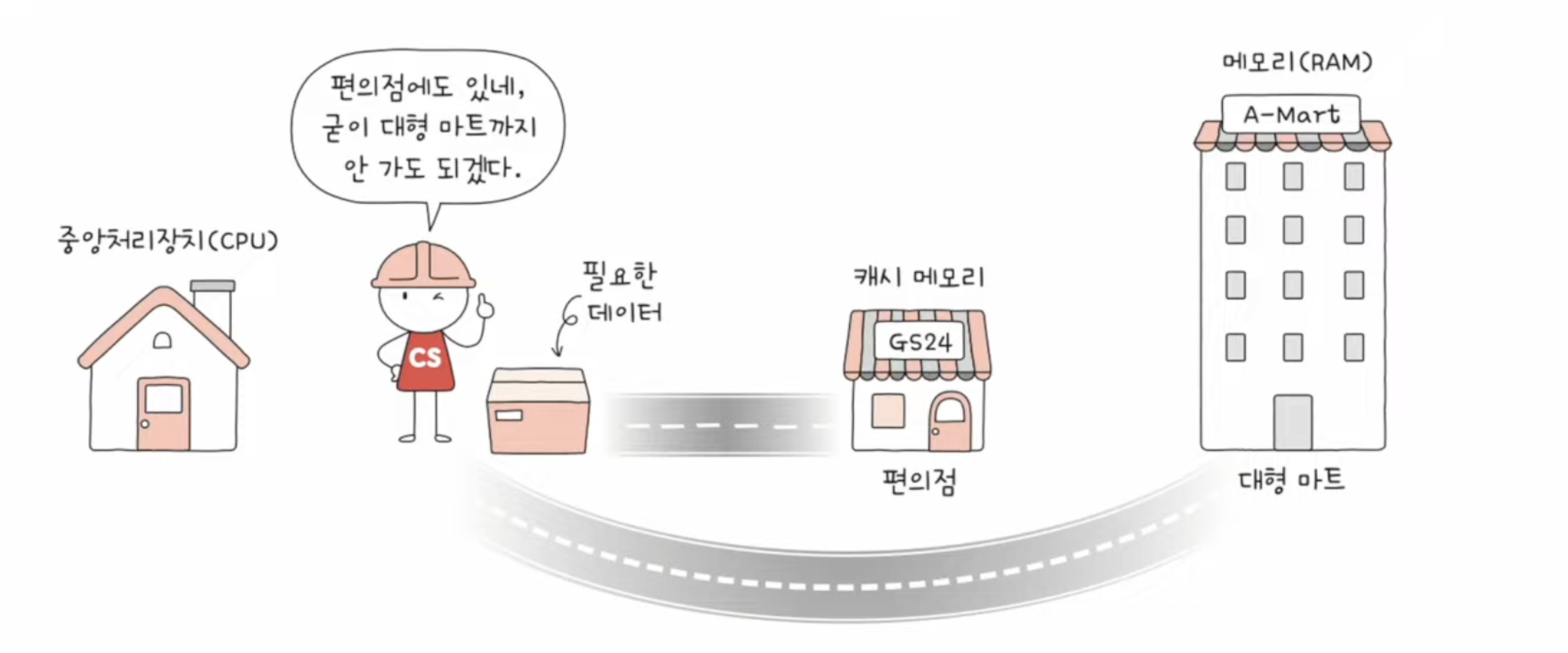 - 이를 극복하기 위한 저장 장치로 캐시 메모리가 쓰임