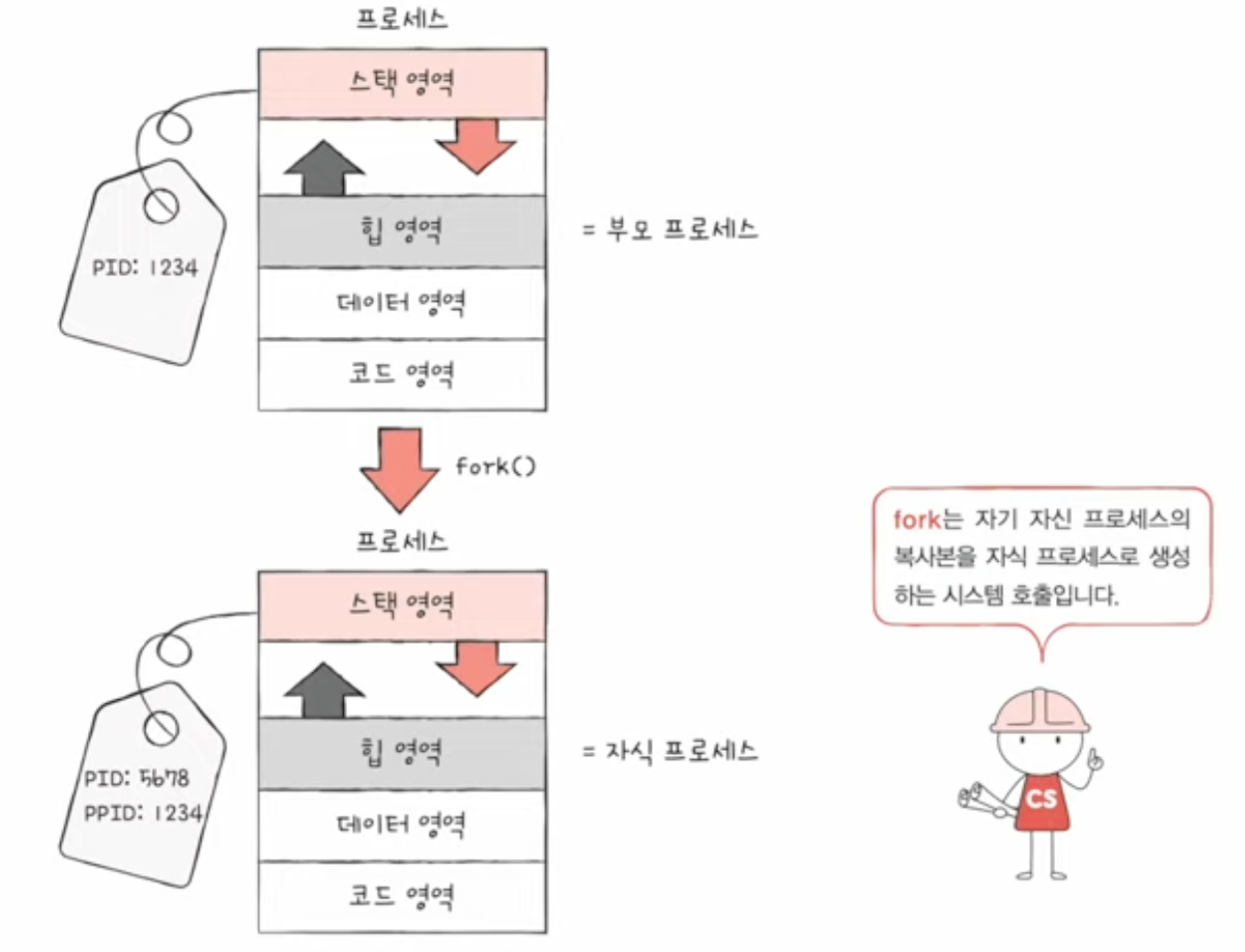 - 둘은 각자 다른 PID를 가지고 일부 운영체제에서는 자식 프로세스의 PCB에 부모 프로세스의 PID인 PPID가 기록되기도 함