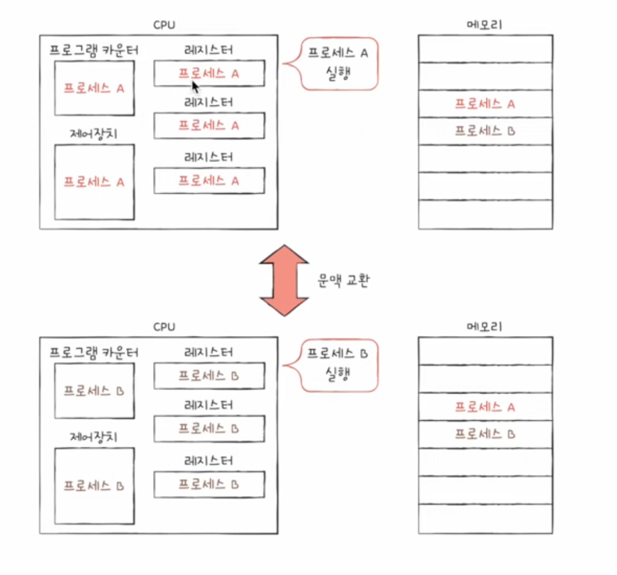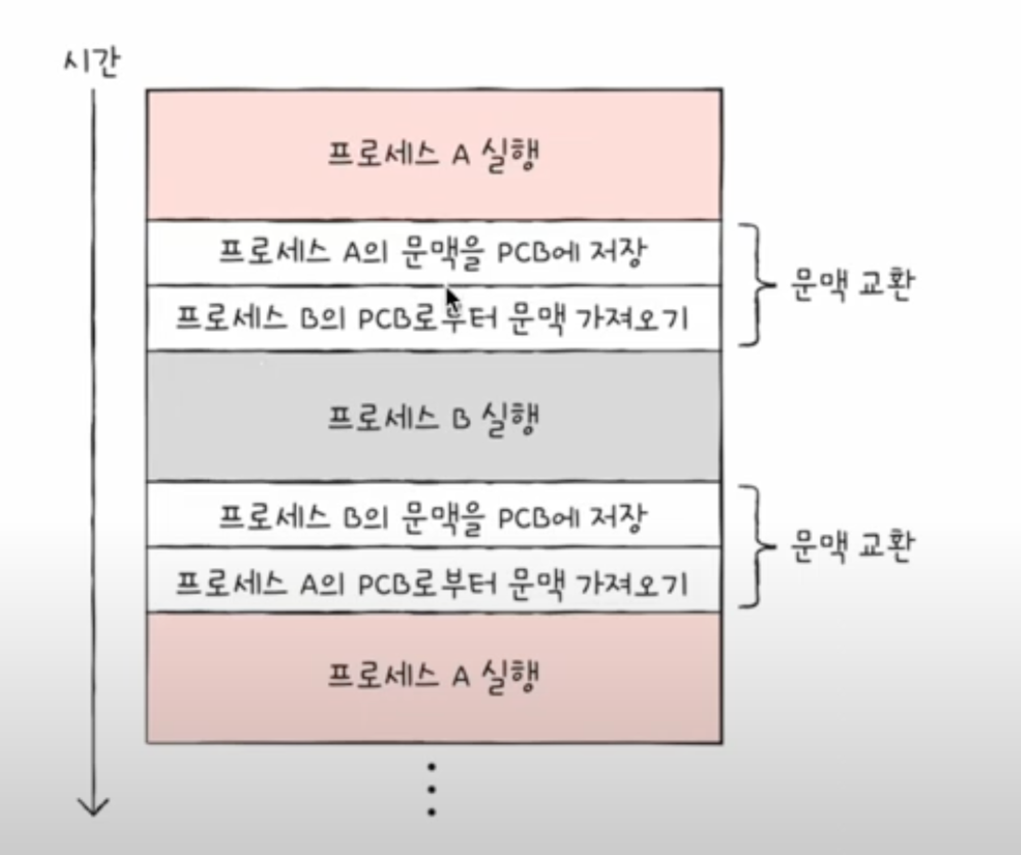 문맥: 하나의 프로세스 수행을 재개하기 위해 기억해야 할 정보로 PCB에 표현되어있음