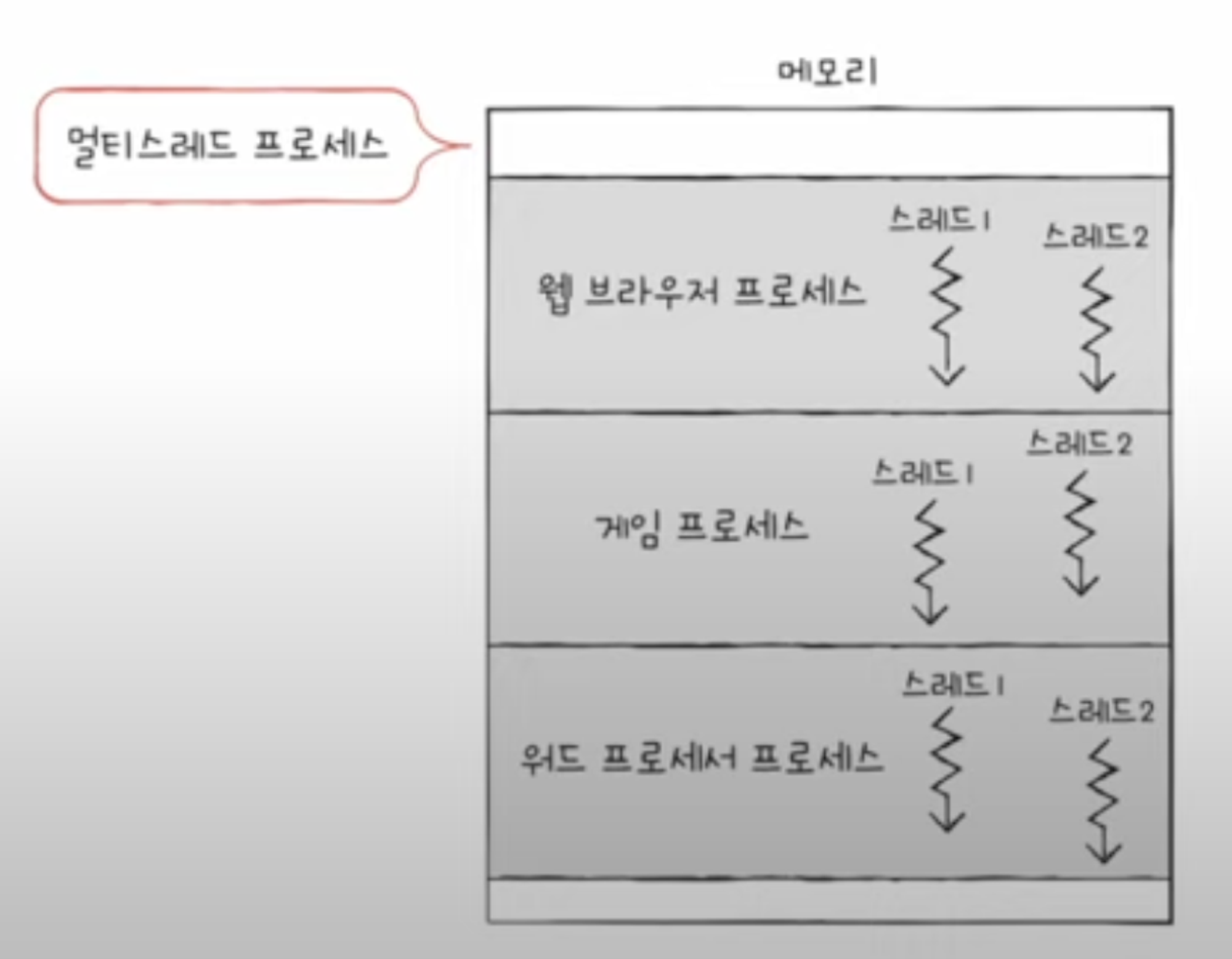 - 전통적인 관점에서 하나의 프로세스는 한번에 하나의 일만 처리 → 단일 스레드 프로세스