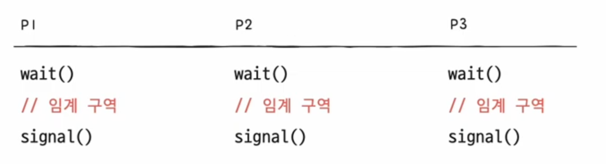 - 두 개 이상의 프로세스가 임계 구역에 진입하고자 하면 둘 중 하나는 대기해야 함