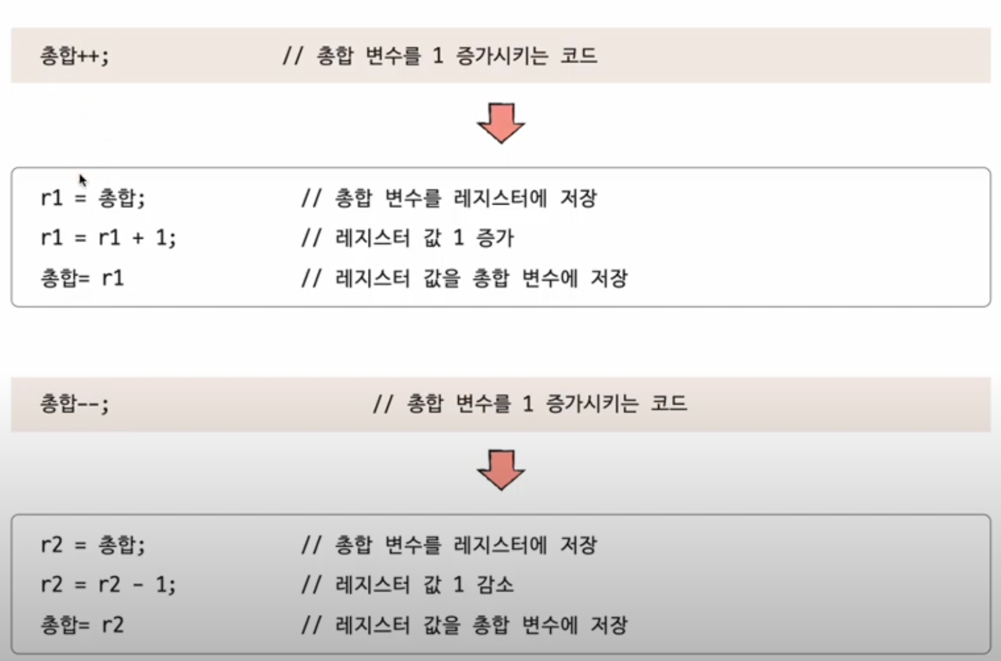 - 고급언어(C/C++, Python) → 저급언어로 변환되며 코드가 늘어날 수 있음