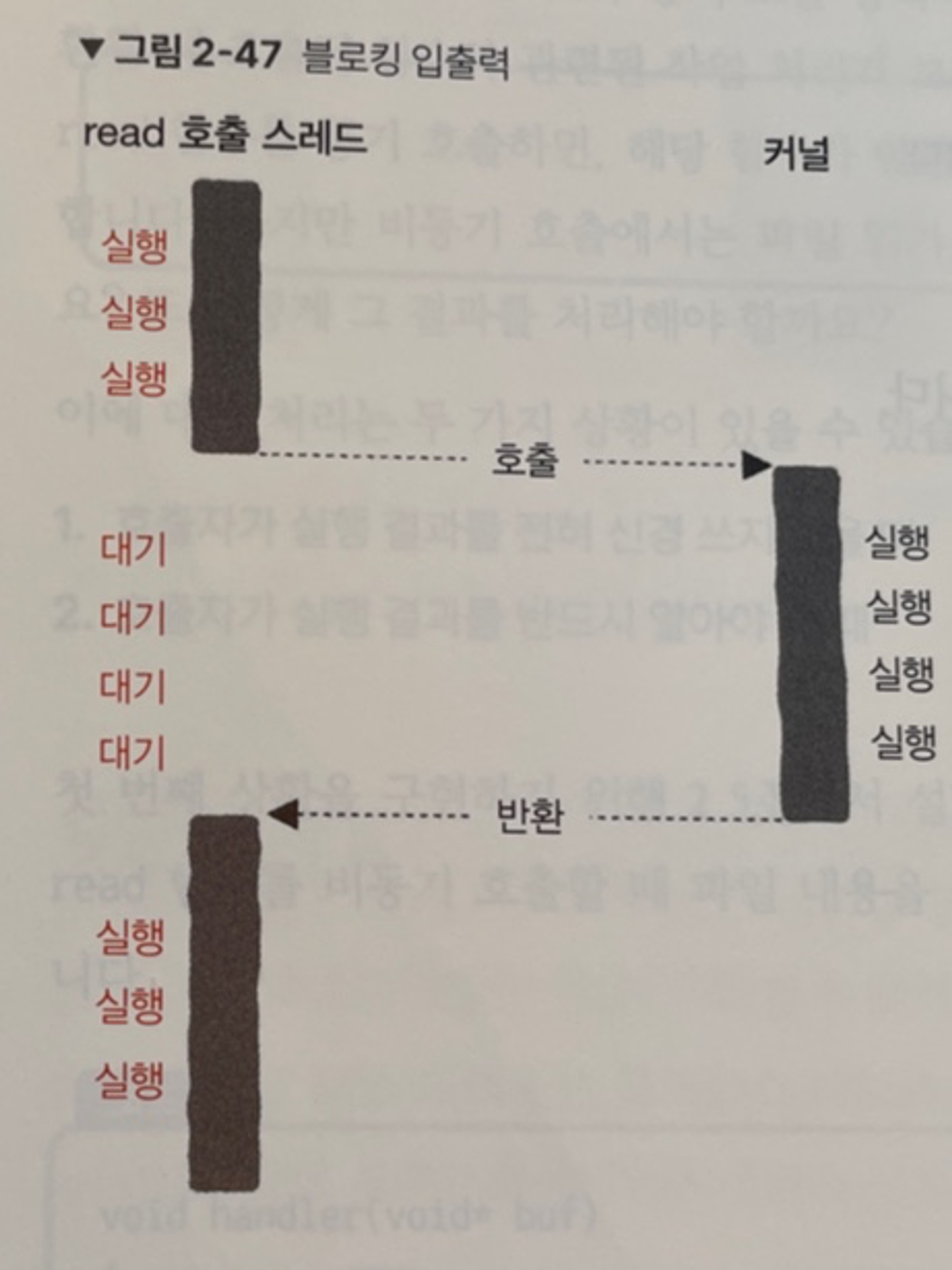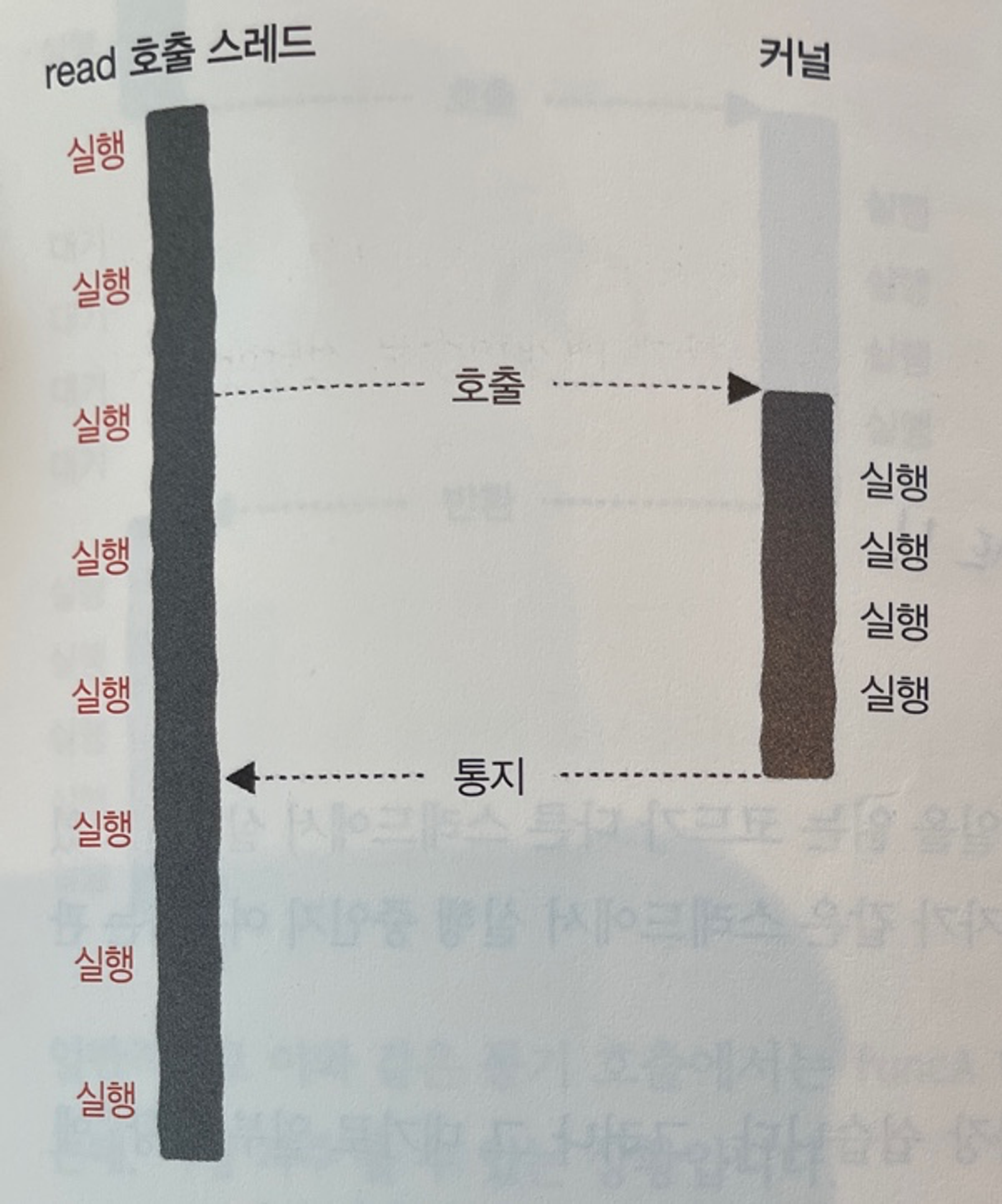 - 파일 읽기 작업을 위해 read 호출 스레드를 일시 중지하고, 커널이 디스크 내용을 읽어 오면 일시 중지 되었던 스레드가 다시 깨어남 (Blocking input/output 이라고 함)