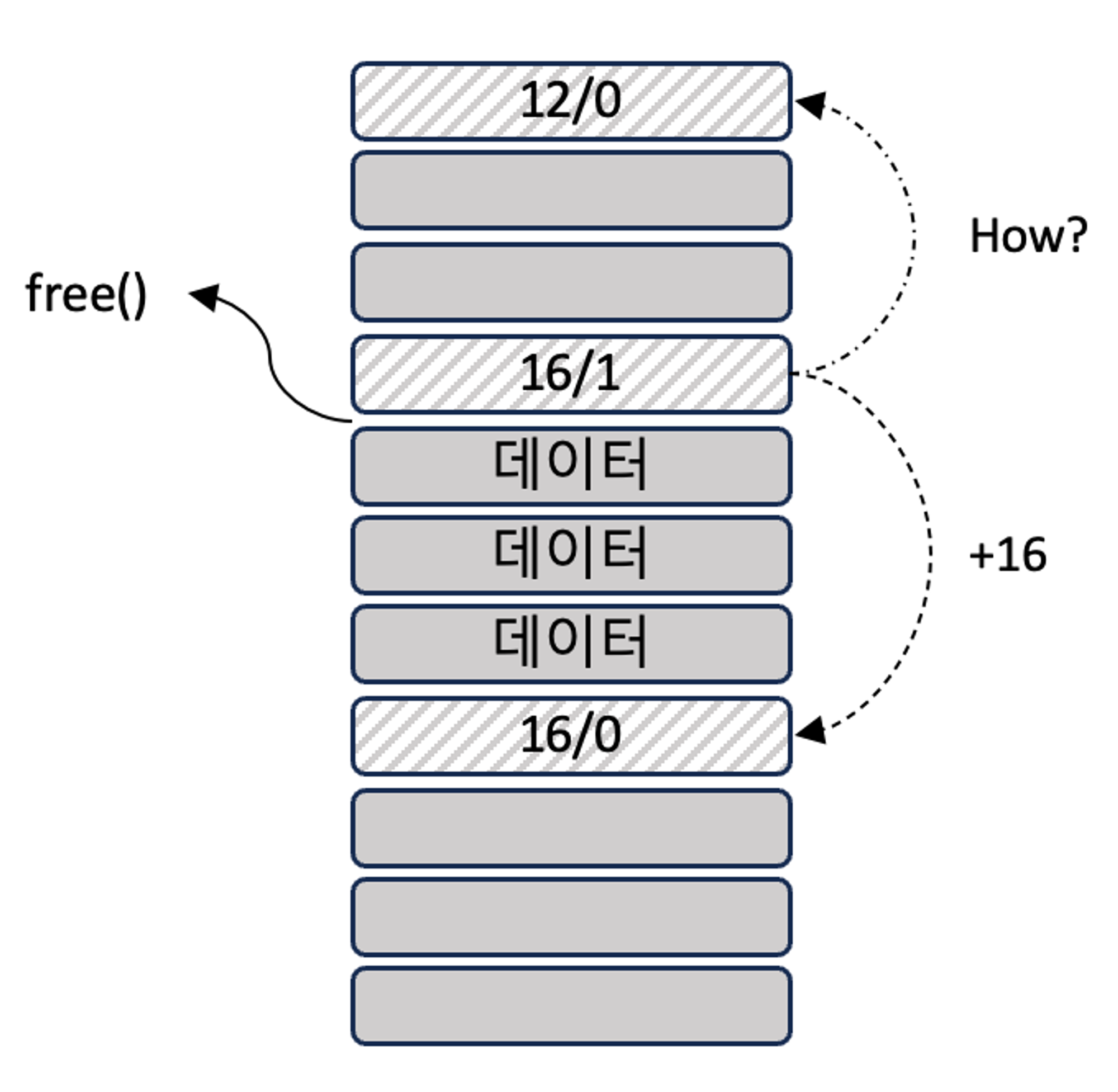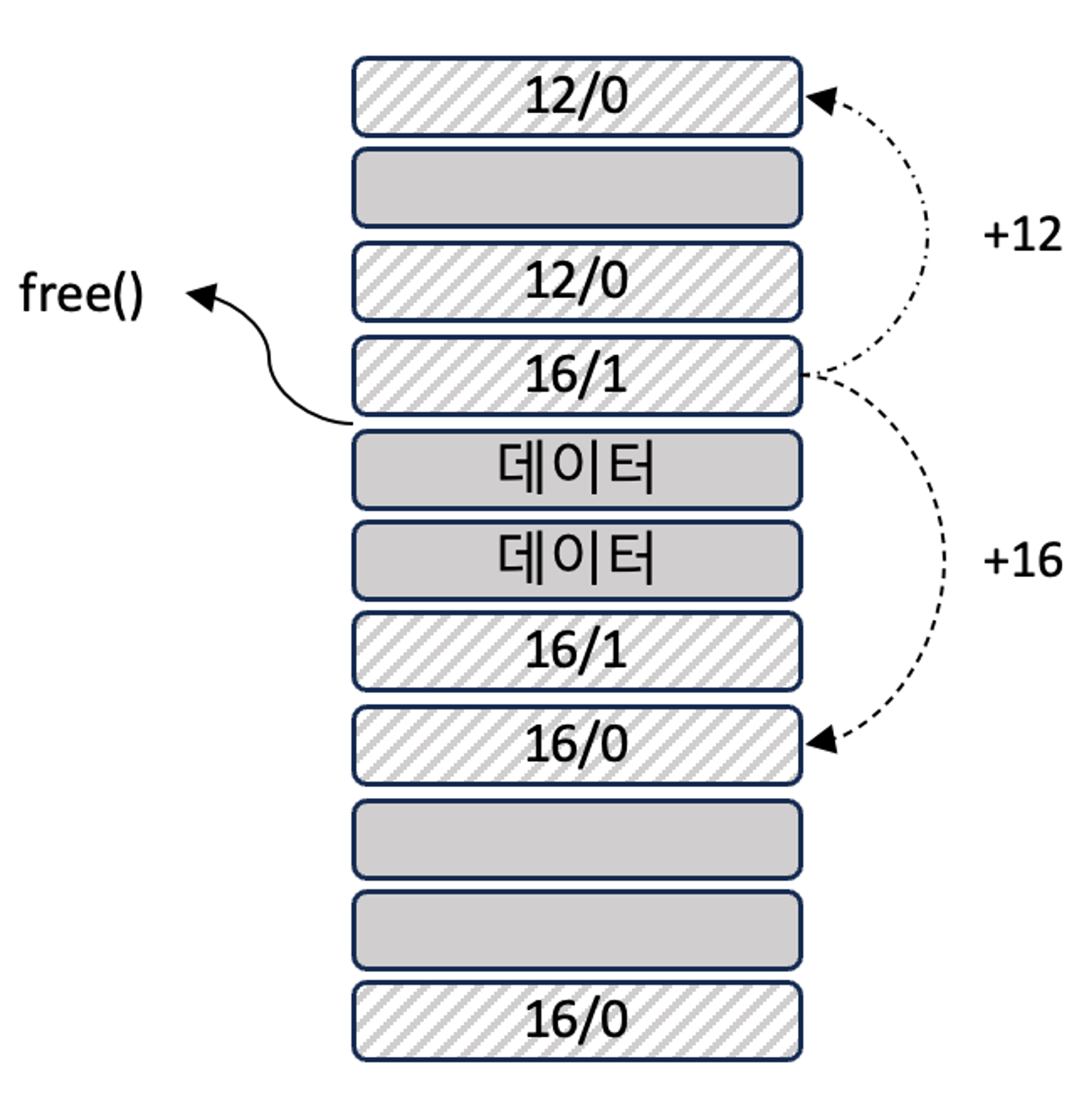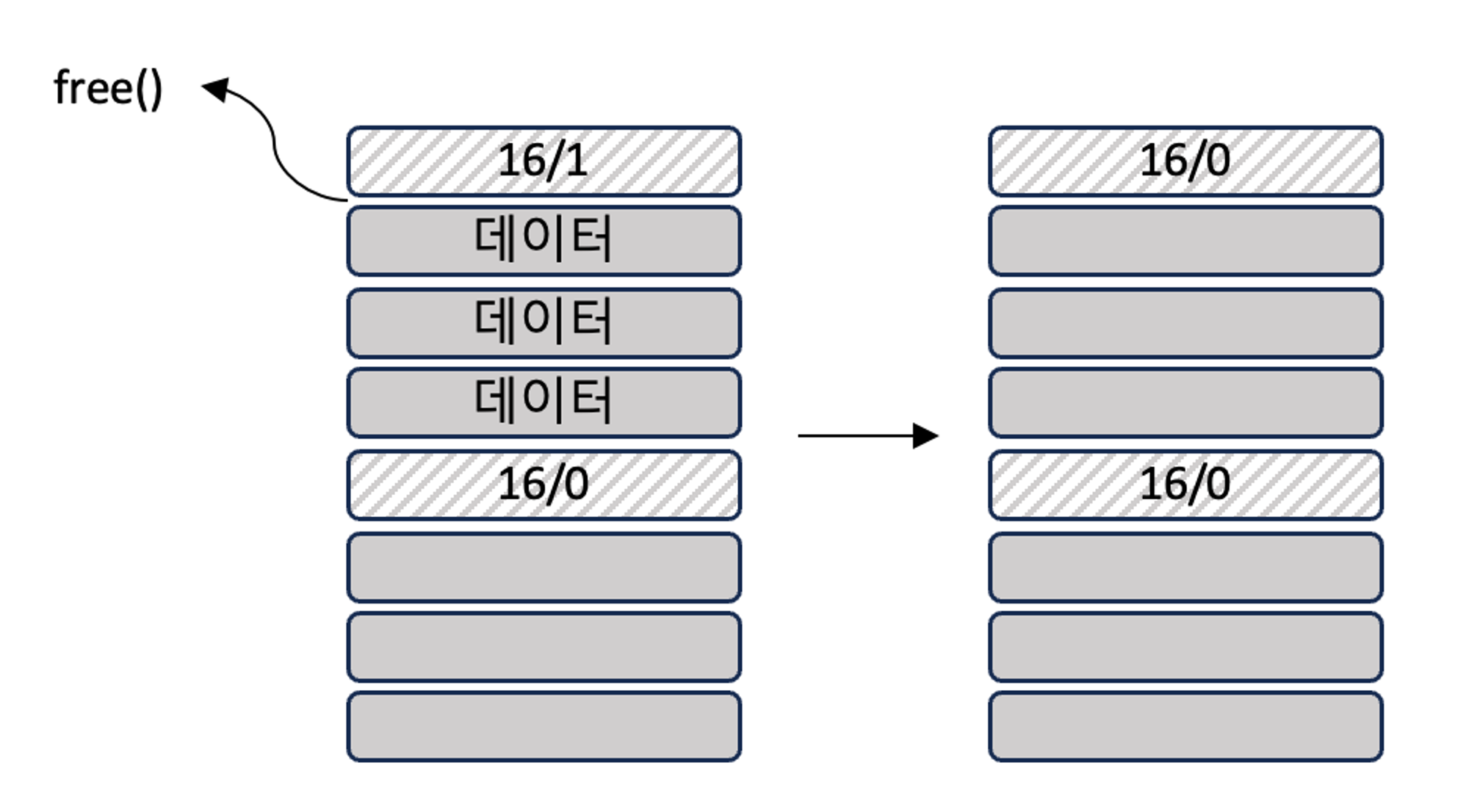 - 해제되는 메모리 조각과 인접한 메모리 조각이 여유 메모리 조각일 때 단순히 해제 여부만 기록하면 아래 상황 발생