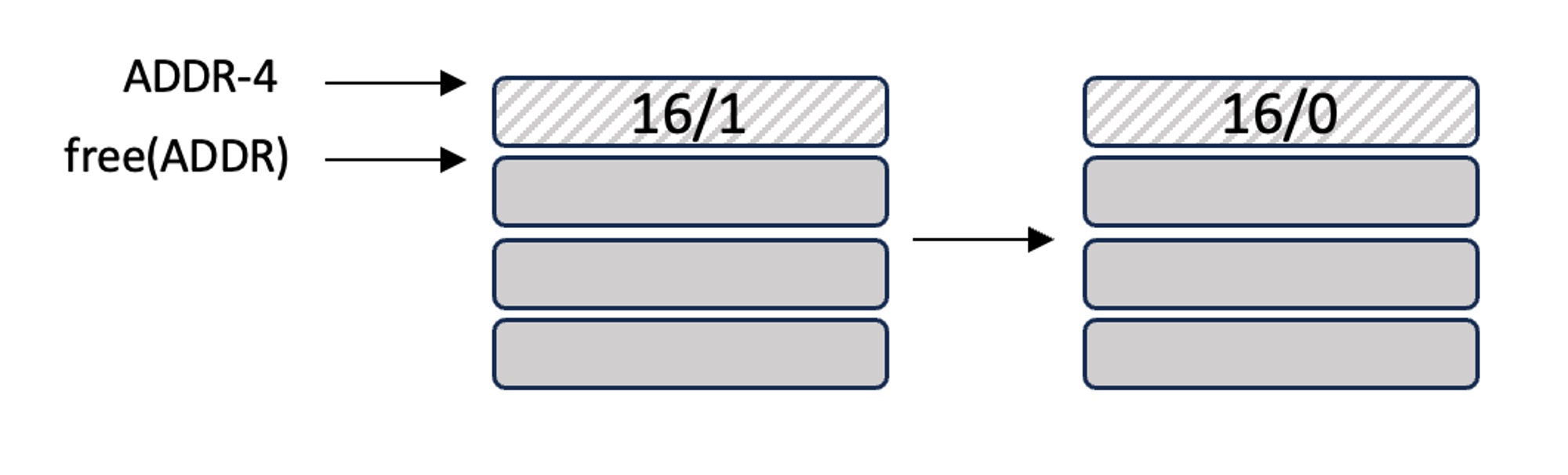 - free(ADDR)을 호출하면 매개변수인 ADDR에서 머리 정보 크기인 4바이트를 빼는 것으로 메모리 조각의 머리 정보 얻을 수 있음