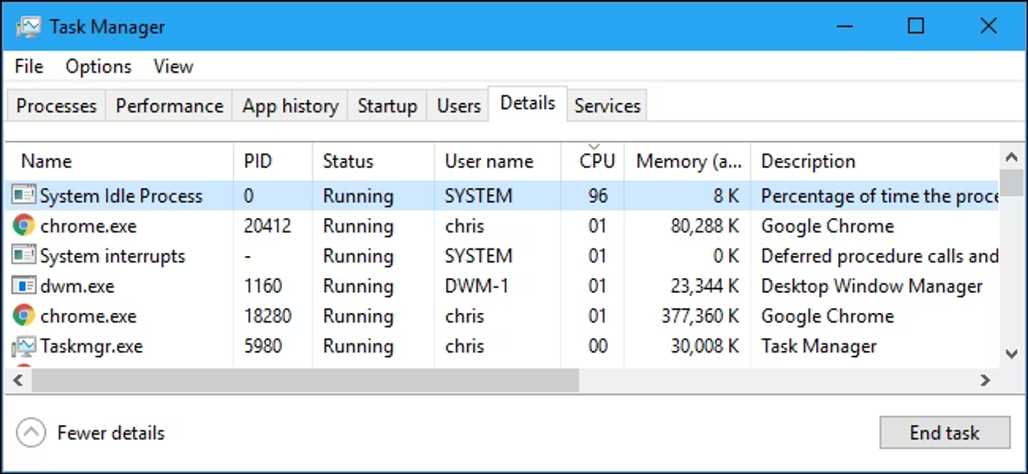 - Windows 경우 아래와 같이 Task Manager 의 Details 탭의 CPU 컬럼에서 확인할 수 있다.