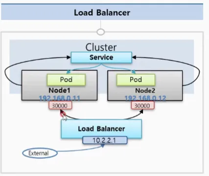 - NodePort의 성격을 그대로 가지고 있고 추가적으로 Load Balancer가 생김 (트래픽 분산)