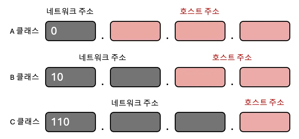 - 클래스를 이용하면 필요한 호스트 IP 개수에 따라 네트워크 크기를 가변적으로 조정해 네트워크 주소와 호스트 주소를 구획할 수 있음